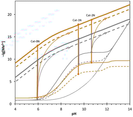 The calculated free Cd2+ (orange) and Zn2+ (gray) concentrations. The thin solid and dashed lines represent the values for 0.15 M total Zn2+ and 0.05 M total Cd2+ concentration for the excess (TNH3 = 3 M) and stoichiometric amount of ammonia (TNH3 = 1.5 M), respectively. The thick solid and dashed lines show the free equilibrium concentration at 0.22 M and 0.02 M total sulfide concentration, respectively. The thin dotted line shows the free Zn2+ concentration, taking only the formation of hydroxo complex into account. For the meaning of the vertical lines and the arrows, see the text.
