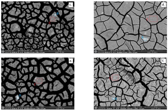SEM images of Cat-0N-0H (a), Cat-0N (b), Cat-1N-0H (c), Cat-1N (d), Cat-2N-0H (e), and Cat-2N (f). The rectangles indicate the area analyzed by EDS. The “whole area” is not signed (by a green A) in the case of (c–f).