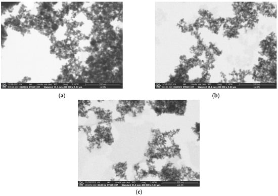 For the morphological study of the catalysts prepared from solutions of different ammonia contents, STEM measurements were carried out, the result of which are shown in Figure 8. Higher ammonia concentrations applied during preparation unambiguously decreased the particle size. In the case of the catalyst prepared in the absence of ammonia, the size of the particles was in the region of about 10–40 nm (Figure 8a), and the shape of the particles were not elongated, i.e., nearly spherical. These results are in accordance with the XRD data (see Section 2.4), which showed the highest crystallite size in sphalerite. The large particle size may be one of the factors that decreased photocatalytic performance. Using ammonia, nanorods (or rather elongated nanoparticles) were formed with a typical diameter of 5–10 nm, and a length of 20–30 nm (Figure 8b). The particles prepared at the highest ammonia concentration were the smallest in size, 5–10 nm (Figure 8c).