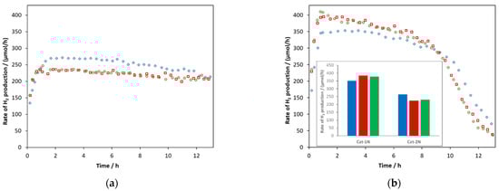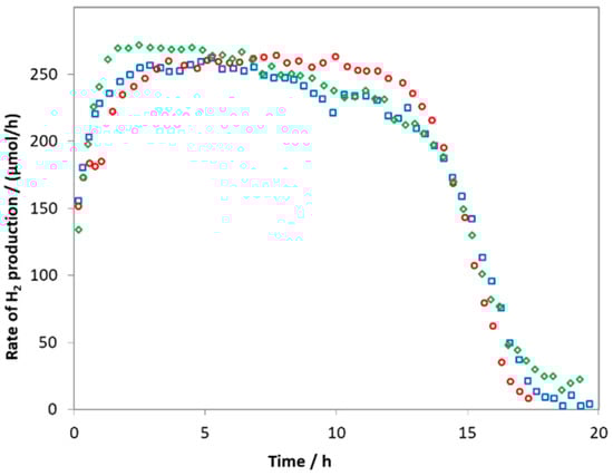 In this paper, we depicted the rate of hydrogen production (RHP) as a function of the illumination time, but in the bar diagrams, its average calculated for the 200–400 min time range is represented. RHP is provided by μmol H2 evolved during one hour (i.e., the unit of measurement is μmol/h). The temperature of the collected hydrogen was the same for each experiment (22 °C), we used the same light source and geometrical arrangement for all irradiations in this work. Hence, RHP is linearly proportional to the quantum yield of the hydrogen production.