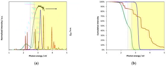 Normalized (a) and cumulative (b) intensity of the light sources applied for illumination (blue line: UV-LED, red: Hg-Xe arc lamp, green: vis LED). The emission spectra as functions of wavelength are also shown in the SM (Figure S4). The solid black line represent the KM-function, while the gray dashed lines indicate the intermediate energy range where the absorption steeply increases from the band gap for the Cat-2N catalyst. The yellow background symbolizes the light absorbed by the photocatalyst.