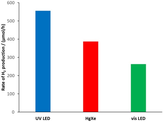 The number of incident photons were determined as described in the experimental part and in the Supplementary Materials, and the results are summarized in Table 5. The number of absorbed photons for opaque solids is difficult to calculate. Although it might be estimated from the DRS spectra, in this case the geometrical arrangement and the thickness of the catalyst layer were different, hence it was evaluated from the band gap. The number of the absorbed photons was calculated by supposing that all photons of higher energy than the band gap were absorbed. Of course, the value obtained in this way was higher than the actual value. In the case of illumination with the 380 nm LED, almost all photons were absorbed and the calculated IPCE and the QY were almost the same (9.2%). The IPCEs for the Hg-Xe lamp and for the visible LED were 6.8% and 1.9%, respectively.