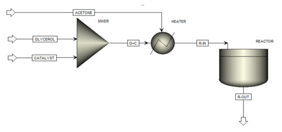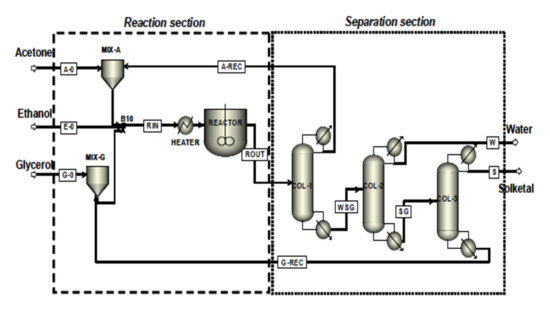 Figure 1 shows that one mole of glycerol reacts with one mole of acetone to produce one mole of solketal and water. The industrial catalyzation process involves a series of unit operations including mixers, reactor, separators, and distillation columns [29], as presented in Figure 2.