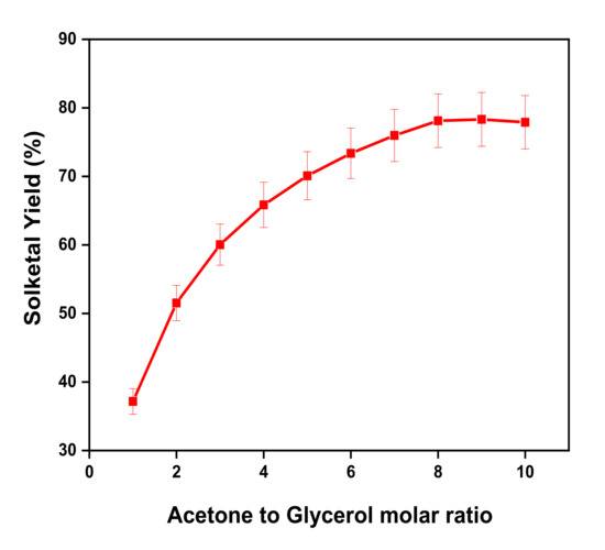 The acetone to glycerol molar ratio plays a significant role in the ketalization process. The ketalization reaction of glycerol and acetone is reversible in nature [34]. Therefore, the acetone to glycerol molar ratio is the important input parameter that can help shift the reaction toward the product side as guided by Le chatelier’s principle. A higher acetone to glycerol molar ratio causes a significant enhancement in the yield of solketal [35]. To study the influence on solketal yield, the acetone to glycerol molar ratio was varied between 2 and 10 to achieve the maximum solketal yield. Figure 4 presents that the solketal yield increased as the ketalization reaction was taken place at the higher acetone to glycerol molar ratios.
