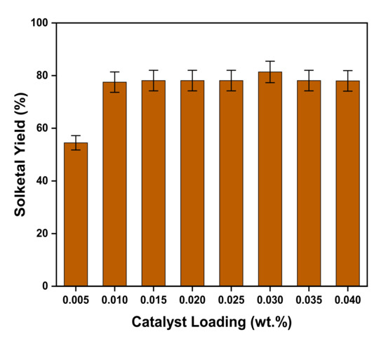 The purpose of adding a catalyst in the ketalization process is to maximize the solketal yield with the minimum associated reaction time. Overall, the increase in catalyst loading increases the number of active sites, causing a significant increase in the catalyst activity and resulting in a higher solketal yield [17,43]. The concentration of H2SO4 was varied in the range of 0.005 to 0.040 wt %. The effect of catalyst loading on solketal yield is presented in Figure 6.