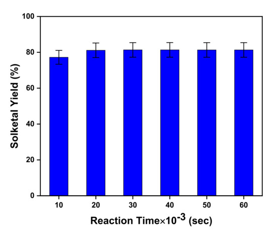 The ketalization reaction time plays a very significant role to maximize the conversion of glycerol. When the ketalization reaction starts, glycerol and solvent (acetone) are not completely miscible, and hence, the reaction is slower in nature [26]. However, the solubility of glycerol and acetone increases with the increase in the reaction time that leads to an increase in the overall yield of solketal. The same findings were observed in the study with the time variance between 10,000 and 60,000 s. The influence of reaction time on solketal yield is presented in Figure 7.