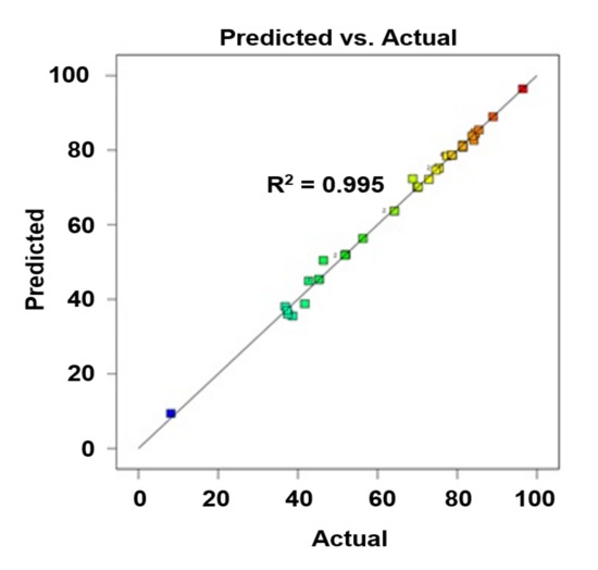 The comparison of accuracy of the chosen regression models presented in Table 8 proved the suitability of the quadratic model with a confidence level of 99.3%. The lack of fit F and p values for the model were observed to be 3.42 and 0.054 (not significant), as shown in Table 7. For a significant model, F values should be lower, and the p-value should be greater than 0.05 according to the statistical analysis rules. The same observation was reported in this study. Therefore, the model has fit the maximum simulation runs for the ketalization of glycerol with 0.7% inaccuracy. The value of R2 is determined to check the reliability and accuracy of the fitted model. A graphical representation of the predicted and simulated yield of solketal yield is presented in Figure 8, which exhibited a high correlation and reasonable agreement between predicted and actual results. The good estimation of solketal yield from the chosen model has represented a good similarity between actual and predicted simulation results.