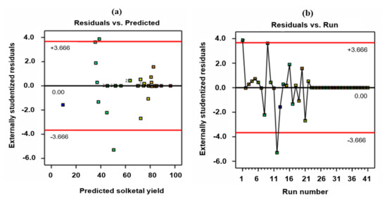 From Figure 8, the predicted and actual solketal yield shows the confidence level of 99.5%, proving the significance of the model. Residuals plots present the level of deviation between predicted and actual values. If the simulation values errors are random, residuals follow a random distribution. Therefore, it is important to analyze the residuals whether they are randomly distributed or not before explaining the interaction of parameters. Therefore, the residuals were normalized and divided with an estimate of standard deviation and presented as studentized residuals, as shown in Figure 9.