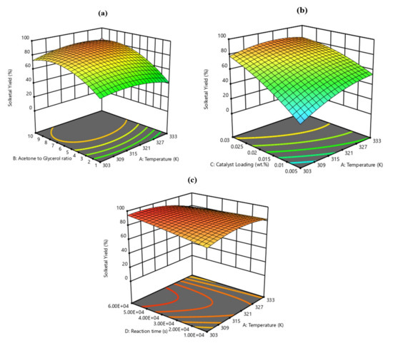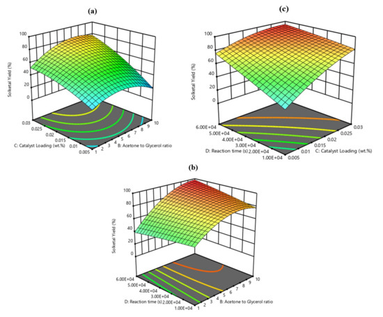 Three-dimensional (3D) surface plots obtained for solketal yield at the center point of CCD are shown in Figure 10a–c. Figure 10a expresses the influence of reaction temperature and glycerol to acetone molar ratio on solketal yield at the catalyst loading of 0.03 wt % and the reaction time of 40,000 s. The increase in acetone to glycerol molar ratio and ketalization reaction temperature increased the solketal concentration. The findings reported in this study indicated that the highest conversion of glycerol can be obtained at the optimized conditions of reaction temperature and acetone to glycerol molar ratio. However, the increase in solketal yield was observed until the specified acetone to glycerol molar ratio and reaction temperature. The higher acetone to glycerol molar ratio leads to a decrease in the glycerol conversion, making the product separation difficult. Therefore, the optimum solketal yield was observed at the moderate values of acetone to glycerol molar ratio (9) and reaction temperature of (313 K).