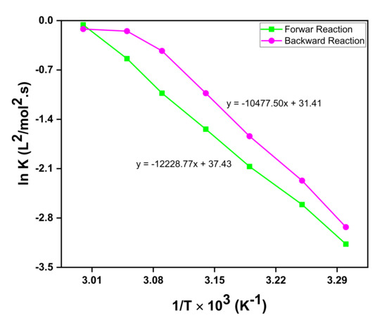 In Equations (3)–(5), CGly, CAc, Csk, and Cw are the concentrations of glycerol, acetone, solketal, and water, respectively. Overall, the increase in the reaction temperature gradually decreases the equilibrium constant, ensuring the exothermic nature of the reaction [52]. The equilibrium constant at the optimized reaction conditions was found to be 0.714. The activation energy and Arrhenius constant for forward and backward reactions were determined using the Arrhenius plot. The Arrhenius equation for activation energy calculation is expressed in Equation (6).