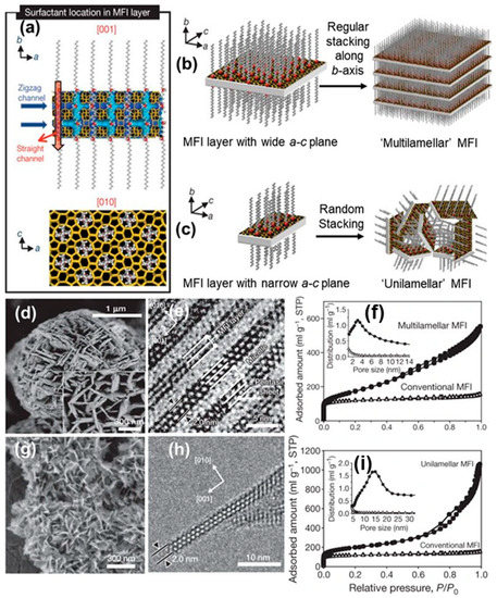 - Zhang, Y.; Shen, X.; Gong, Z.; Han, L.; Sun, H.; Che, S. Single-Crystalline MFI Zeolite with Sheet-Like Mesopores Layered along the a-Axis. Chem. Eur. J. 2019, 25, 738–742. [Google Scholar] [CrossRef]