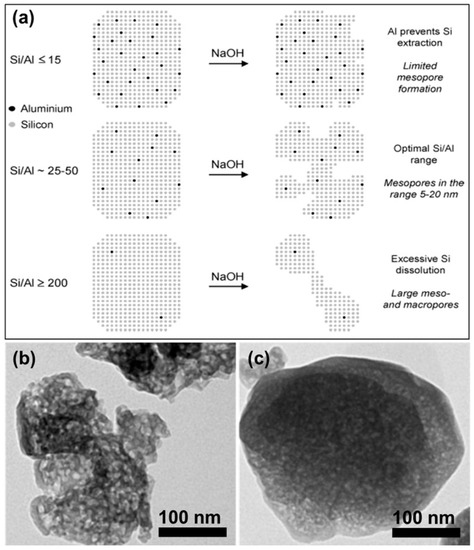- Groen, J.C.; Jansen, J.C.; Moulijn, J.A.; Pérez-Ramírez, J. Optimal aluminum-assisted mesoporosity development in MFI zeolites by desilication. J. Phys. Chem. B 2004, 108, 13062–13065. [Google Scholar] [CrossRef]