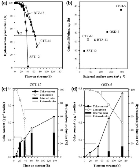 - Milina, M.; Mitchell, S.; Crivelli, P.; Cooke, D.; Pérez-Ramírez, J. Mesopore quality determines the lifetime of hierarchically structured zeolite catalysts. Nat. Commun. 2014, 5, 3922. [Google Scholar] [CrossRef] [Green Version]