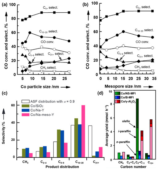 - Kim, J.-C.; Lee, S.; Cho, K.; Na, K.; Lee, C.; Ryoo, R. Mesoporous MFI Zeolite Nanosponge Supporting Cobalt Nanoparticles as a Fischer-Tropsch Catalyst with High Yield of Branched Hydrocarbons in the Gasoline Range. ACS Catal. 2014, 4, 3919–3927. [Google Scholar] [CrossRef]