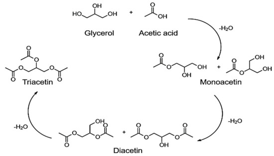 Reaction pathway of acetylation of glycerol with acetic acid.
