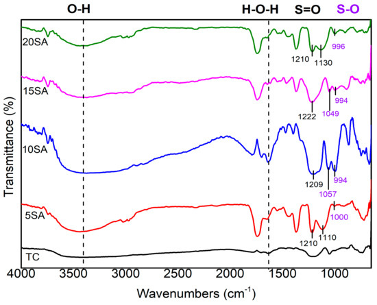 Figure 2 shows the FTIR spectra of all synthesized catalysts. The FTIR analysis was performed to confirm the presence of the sulphate group in the sulphated-titania catalyst and to evaluate the effect of sulfuric acid concentration on the band properties for each functional group of the synthesized catalyst. For sulphated catalysts (5SA, 10SA, 15SA, and 20SA), strong broadband between 3600 cm−1 and 3000 cm−1 is assigned to O–H stretching in H-bonded water. The chemical and physical absorption of the hydroxyl group on the surface of the sulphated catalysts proves that these catalysts are anhydrous metal oxide catalysts [44,45]. The band observed at 1632 cm−1 is due to the scissor bending vibration of the molecular water (H–O–H), assigned as chemisorbed water [46,47]. A band between 1222 cm−1 to 1100 cm−1 are assigned to the S=O group which indicates the existence of sulphate species. Besides, the bands between 1057 and 994 cm−1 was attributed to symmetry and asymmetry stretching of the S-O bond [17,48] has obtained a similar observation, where the S-O bands are assigned to chelating bidentate SO42− in coordination with Ti4+ metal. Therefore, the experimental result of the FTIR spectrum shows that the relative functional group present in synthesized catalysts indicates the sulfation has successfully occurred in this study.