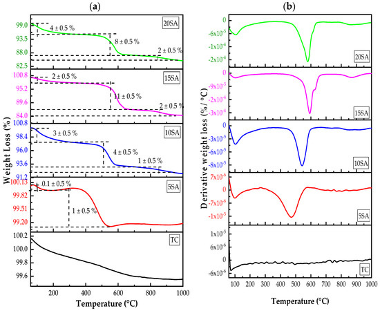 The TGA-DTG curve of non-sulphated (TC) and sulphated-titania catalyst (5SA, 10SA, 15SA, and 20SA) was shown in Figure 4. The thermal stability and decomposition of the synthesized samples were evaluated within the range of 50–1000 °C. For TC, a minor weight loss at temperature <200 °C due to loss of hydrate compound presence in TC was observed. Dabbawala et al. [49] and Deris et al. [52] also found that the moisture or water molecule decomposition occurs at a lower temperature (<200 °C). As mentioned in the XRD results, the sulphated-titania catalysts are anhydrous metal oxide catalysts. The first weight loss for sulphated-titania catalyst also detected at the same temperature range could be due to the decomposition of physisorbed and chemisorb water molecules on the catalyst structure. As observed in Figure 4, the weight loss of water molecules for 20SA is higher than 15SA, 10SA, and 5SA. This is probably due to 20SA having the highest hydrophilicity properties compared to other sulphated catalysts [53]. The second weight loss observed at the temperature between 300 and 700 °C represents sulphate decomposition. Among sulphated-titania catalysts, the loss of sulphate group for 5SA occurred at the lowest region (300–600 °C) followed by 10SA (450–650 °C), 15SA and 20SA (500–750 °C). DTG curve also shows that the weight loss at maximum temperature for sulphated titania shifted gradually towards a higher temperature region accordingly. This indicates that sulphate species for 5SA has the weakest bond on the surface of the catalyst. The third weight loss appeared only for 10SA, 15SA, and 20SA catalysts. The weight loss percentage at a temperature range of 850–950 °C is minimal 1 ± 0.5% for 10SA and 2 ± 0.5% for both 15SA and 20SA. This indicates that the high sulphate concentration has strengthened the sulphate intermolecular bond and may require more heat to undergo the sulphur group of decomposition. This finding is in agreement with Liu et al. [53]. At a higher temperature, SO42- in the sulphated sample will escape in the form of SO2.