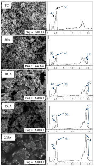 SEM-EDX analysis was used to study the surface morphology and elemental composition of non-sulphated and sulphated-titania catalysts. According to the SEM micrograph in Figure 6, TC shows uniform distribution of spherical particles. From EDX analysis, two peaks detected corresponds to titania and oxygen at 0.5 keV and 0.6 keV, respectively. As can be seen in Figure 6, the morphology for all sulphated catalysts display a nearly spherical shape with a crumb-like structure due to particle agglomeration. However, the EDX analysis clearly shows that all expected elements are present. The elemental compositions present in the sulphated-titania catalysts are titania (Ti), oxygen (O), and sulphur (S). The peak detected Ti, O, and S at 0.5 keV, 0.6 keV, and 2.3 keV, respectively. Hence, the additional peak of S confirmed that the sulfation was successfully impregnated on the Ti surface. This finding is similar to Liu et al. [53]. Besides, the intensity peak of sulphur increased as the sulfuric acid concentration increased. This finding correlates with XRF and NH3-TPD analysis. The number of sulphate and active sites increases according to the increment in sulfuric acid concentration.