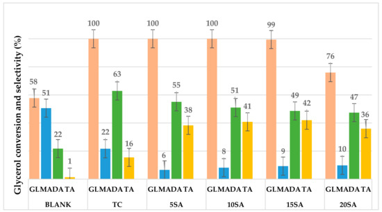 The glycerol acetylation was performed at an operating condition temperature of 100–120 °C, 0.5 g of catalyst loading, and glycerol: acetic acid mole ratio of 1:6. This study was carried out to find an outstanding sulphated-titania catalyst in producing the highest TA selectivity. Figure 7 displays the glycerol conversion and MA, DA, and TA selectivity for blank, TC, 5SA, 10SA, 15SA, and 20SA. A blank reaction is a reaction that was conducted without a catalyst. As can be seen in Figure 7, for blank reaction, the 58% glycerol was converted into acetins (51% MA, 22% DA, and 1% TA). The acetic acid can act as a self-catalysing effect and could drive the reaction forward due to its acidic nature. This finding was similar to Nda-Umar et al. [26]. Moreover, the glycerol conversion was significantly increased when using non-sulphated titania (TC) up to 100%. The composition of acetins achieved was 22% MA, 63% DA, 16% TA. Even though the active acid sites for TC is lower (12.9 µmol g−1), it is sufficient to allow the reaction to happen. The high surface area (11.8 m2 g−1) and sufficient pore volume (0.0003 cm3 g−1) and pore diameter (5.4 nm) could contribute to the TA formation. The results on glycerol conversion for sulphated-titania catalyst at different sulfuric acid concentrations are showing a trend. Increasing the sulfuric acid concentration decreases the glycerol conversion. According to Figure 7, the highest TA selectivity was obtained at 15SA (42%), followed by 10SA (41%), 5SA (38%), and 20SA (36%), respectively. These findings aligned with the physicochemical properties of the synthesized sulphated titania at different concentrations. Even though the TA selectivity for each catalyst shows a small difference, especially for 10SA and 15SA. The 15SA catalyst has been chosen as the best catalyst for glycerol acetylation. The catalyst produced the highest TA selectivity owing to its higher acid sites density (342.6 µmol g−1) as compared to 10SA. The TA selectivity for 20SA was lower, even though the acid sites density was higher (444.6 µmol g−1). This may be due to its lower surface area (0.2 m2 g−1), pore volume (0.00003 cm3 g−1), and pore diameter (5.2 nm). The triacetin molecule requires sufficient space to form.