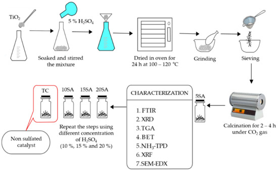 The sulphated-titania oxide catalysts were prepared through the impregnation method as shown in Figure 8. Firstly, TiO2 was soaked in the 5 v/v% sulfuric acid solution for 24 h at room temperature. The sulphated-titania was dried overnight in an oven at a temperature of 100–120 °C. After that, the dried sulphated titania was ground and sieved using a mesh sieve (350 µm). The sample was then calcined in a tabular furnace at a temperature of 400–500 °C for 2–4 h under a CO2 environment. The synthesized catalyst was labelled as 5SA. The procedures were repeated similarly but at various concentrations and the prepared samples were denoted as xSA, where x attributed to sulfuric acid concentration (10, 15 and 20%). Non-sulphated titania catalyst was also prepared as a precursor without adding sulfuric acid into the titania and denoted as TC.