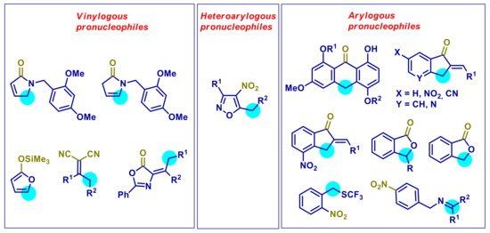 Vinylogous and (hetero)arylogous pronucleophiles employed in PTC processes. Blue halos indicate the preferential nucleophilic site. The leading electron-withdrawing group is marked in green.