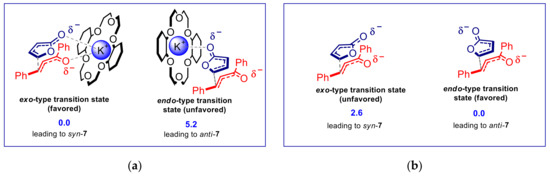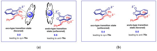 The effect of solvent and catalyst structure, as well as DFT calculations, supported a transition state model involving chelation to the alkali metal cation [60]. A key point to consider is that K+⊂18-crown-6 and analogous complexes are characterized by a positive charge which is readily accessible on the open faces of the macrocycle plane. This makes it very easy, under appropriate conditions (e.g., low dielectric constant solvents, such as toluene), the establishment of contact ion pairs and coordination complexes. In toluene, DFT calculations predict a preference for chelated transition state model characterized by an exo approach of the reactants, leading to the syn adduct (Figure 4a). As the dielectric constant of the solvent increases, causing a larger degree of ion pair separation and inhibiting coordination, the syn-anti diastereomeric ratio decreases accordingly. A small prevalence of the anti-adduct was indeed observed in DMF, as a result of a slight preference for the endo approach between reactants, correctly predicted also by DFT calculations performed on the “naked” 1-oxyisobenzofuran enolate in DMF (Figure 4b). In corroboration of this hypothesis, reaction performed with phase-transfer catalyst which generate hardly accessible cations, such as bulky quaternary ammonium salts, K+⊂cryptand and K+⊂15-crown-5 sandwich complexes, led to a low syn-anti ratio, determined by a weaker ion-pairing. Moderately accessible benzyl(trimethyl)ammonium salts furnished intermediate diastereoselectivity.