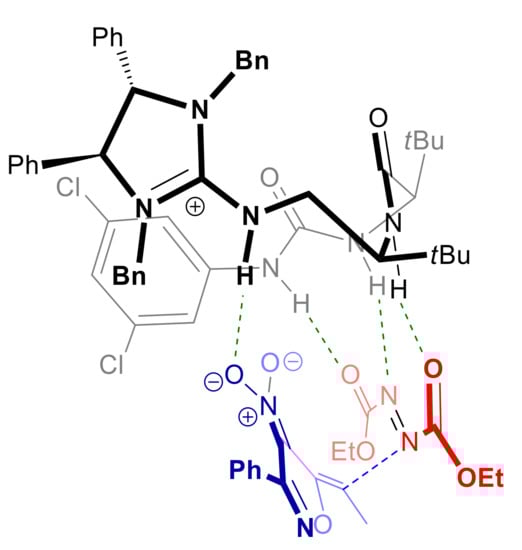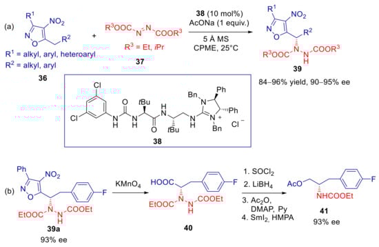 Coote, Jiang and coworkers described the heteroarylogous amination of 5-alkyl-4-nitroisoxazoles 36 with azodicarboxylates 37 catalyzed by the polyfunctional dipeptide-based guanidinium phase-transfer catalyst 38 (Scheme 15a) [89]. Under optimized conditions, with solid sodium acetate as the base in CPME (cyclopentyl methyl ether), hydrazides 39 were obtained with uniformly high yields and ee’s with diethyl or diisopropyl azodicarboxylates, regardless the electronic nature of substituents in 36. A lower level of enantioselectivity was instead observed with di-t-butyl azodicarboxylate. It should be stressed that reaction catalyzed by structurally related amino-thiourea and amino-urea organocatalysts under homogeneous conditions resulted in low yields and enantioselectivities. Synthetic elaboration of hydrazide 39a gave access to the protected α-aminoalcohol 41 without loss of enantiomeric purity (Scheme 15b). DFT calculations and NCI analysis revealed a preference for a transition state in which 37 is activated and suitably oriented by specific hydrogen bonding with both catalyst’s thiourea and amide N-H functional groups, whereas the nitroisoxazole α-carbanion/guanidinium ion pair is held by coulombic interaction as well as NH/NO2 hydrogen bonding (Figure 3). The model is in agreement with the attack on the Si-face of the (Z)-configured heterobenzylic carbanion which is experimentally observed.