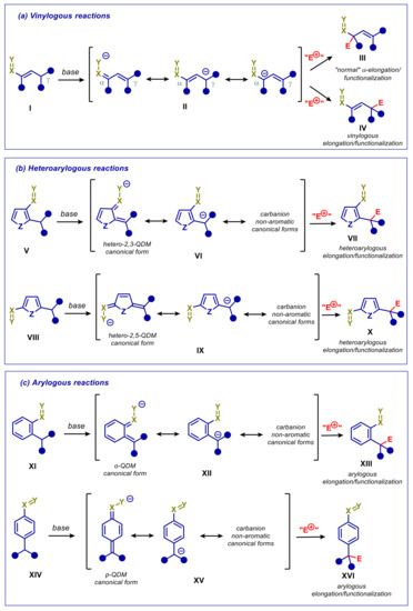 General outline of processes involving vinylogous enolates and related π-extended carbanions: (a) Vinylogous reactions; (b) heteroarylogous reactions; (c) arylogous reactions. Group X=Y is an unsaturated electron-withdrawing group: e.g., (R)C=O, (RO)C=O, CHO, NO2, CN, (R)SO2. Z is a heteroatom. E+ is a generic electrophile.