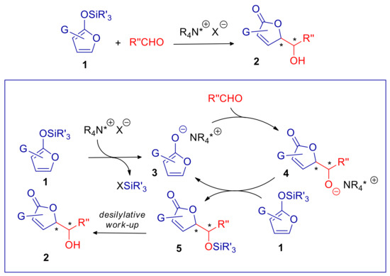 Stereoselective vinylogous aldol reaction of silyloxy furans catalyzed by a (chiral) ammonium salt. X− is a Lewis base anion (e.g., F−, ArO−, RCOO−). The general mechanism is outlined in the box. Chirality centers are indicated with *.