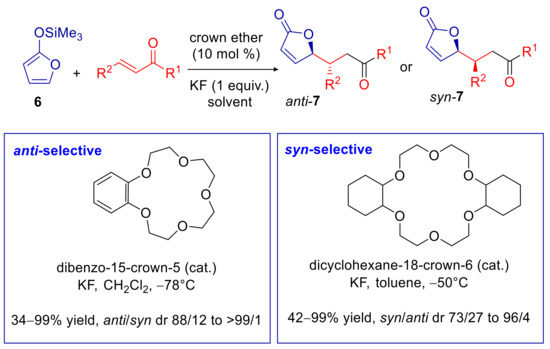 Although the above-mentioned methods do not involve a phase-transfer mechanism, the underlying counterion directed stereocontrol suggests the feasibility of analogous processes, in which an insoluble (or water-soluble) Lewis base species X− is activated by a phase-transfer catalyst. With this idea in mind, our group developed a vinylogous Mukaiyama–Michael reaction (VMMR) of 6 with α,β-unsaturated ketones, using crown ethers as phase-transfer catalyst, in place of the ammonium salt, in the presence of stoichiometric amounts of KF suspended in an organic solvent (Scheme 4) [59]. The reaction works well in various solvents at low temperature (typically −78 °C), but interestingly, an extremely variable diastereoselectivity was observed depending on the medium dielectric constant. In fact, the very high anti-preference achieved in highly (e.g., DMF and CH3CN) and moderately polar (e.g., CH2Cl2) solvents switched to high syn-selectivity moving to a strongly non-polar solvent such as toluene. A similar diastereo-switching from syn to anti adduct was also observed moving from 18-crown-6 derivatives to 15-crown-5 derivatives in the same reaction medium. A strong anti-selectivity also resulted from reaction with catalytic amounts of TBAF under homogeneous conditions in many solvents, as well as from the phase-transfer catalyzed process with [2,2,2]-cryptand. On these grounds, we developed a diastereodivergent VMMR of 6 and α,β-unsaturated ketones, achieving anti or syn selectivity upon appropriate selection of the crown ether catalyst and the solvent (Scheme 4).