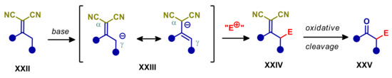 Compounds containing the α,α-dicyanolkylidene functionality are easily enolizable at the γ-position, as long as this is not a quaternary carbon atom (Scheme 6). Such pronucleophiles are among the most used substrates in vinylogous processes, with many type of catalysis [4,63,64]. Part of their success is also due to the easy cleavage of α,α-dicyanolkylidene, affording a carbonyl group. In other words, compounds XXII may be regarded as a “masked” ketone, and its vinylogous reaction considered as a viable alternative to the α-elongation/functionalization of less acidic carbonyl compounds. In addition, the α,α-dicyanovinylidene also presents electrophilic sites at cyano group and β-carbon, being thus suitable for further elaborations and tandem reactions.