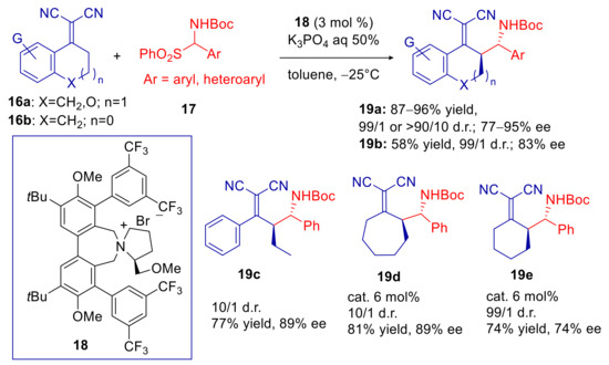 Jørgensen and Niess first demonstrated that substrates XXII are compatible with phase-transfer conditions [65]. They developed a vinylogous enantio- and diastereoselective Mannich reaction of α,α-dicyanolkylidenes 16 with in situ generated N-Boc imines from α-amidosulfones 17, using liquid–liquid conditions and only 3 mol% of Lygo’s catalyst 18 (Scheme 7). Adducts 19 were obtained in high yields, d.r. and ee starting from aromatic six-membered derivatives 16a. The five-membered derivative 16b furnished similar stereoselectivities but lower yields. Apparently the increased flexibility of substrate structure entailed lower diastereomeric ratio, but no fall in enantioselectivity (products 19c,d). Very good results were also achieved with cyclic aliphatic substrates (products 19d,e), even though the lower reactivity required double amount of catalyst. The corresponding enantioenriched aminoketones were obtained by oxidative cleavage with KMnO4 without erosion of ee. Although adducts 19 have also been obtained in extraordinarily high yields and enantioselectivity, starting from preformed N-Boc imines, by using bifunctional organocatalysis [66], the present phase-transfer methodology offers the remarkable advantage of employing much more stable and easily manipulated α-amidosulfones 18.
