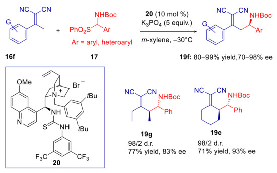 Lin, Duan, and coworkers have recently tried, with a fair degree of success, to combine the above-mentioned advantages of phase-transfer catalysis and better performances of bifunctional catalysis, in this Mannich reaction [67]. A general improvement of stereoselectivities, compared to catalyst 18, were indeed achieved with both cyclic and acyclic dicyanoolefins and α-amidosulfones 17, by using the thiourea-functionalized cinchona alkaloid derived ammonium salt 20 (Scheme 8). These good results were preserved across a wide range of aromatic substituted substrates. Previous studies with N-benzylcinchonidinium chloride, on the other hand, furnished decreased level of enantioselectivity [68].