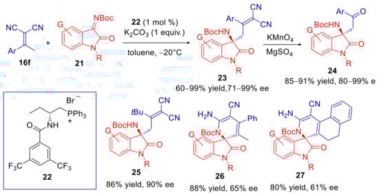 Cao, Wu, and coworkers demonstrated that only 1% mol of chiral phosphonium salt 22, could catalyze the vinylogous Mannich addition of acyclic α,α-dicyanoolefins 16f to N-Boc imine isatins 21 in high yields and ee’s, under base phase-transfer conditions (Scheme 9) [69]. It should be noted that the reaction conducted with the same substrates under homogenous bifunctional organocatalysis, furnished comparable results, but with much higher catalyst loading (10 mol%) [70]. Products 23 were submitted to mild oxidative cleavage with KMnO4, affording formal Mannich adducts of the corresponding acetophenone (24) with preservation of enantiomeric purity (Scheme 9). This phase-transfer catalyzed protocol was successfully applied for the enantioselective synthesis of the tert-butyl derivative 25. The products resulting from addition of propiophenone and tetralone derived α,α-dicyanoalkylidenes, however, turned out to be unstable under such conditions, undergoing subsequent attack of NHBoc group on one cyano group; such cyclization products were isolated in good yields and moderate enantioselectivities (26 and 27 in Scheme 9).
