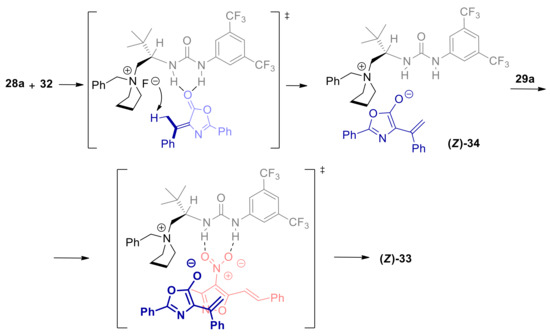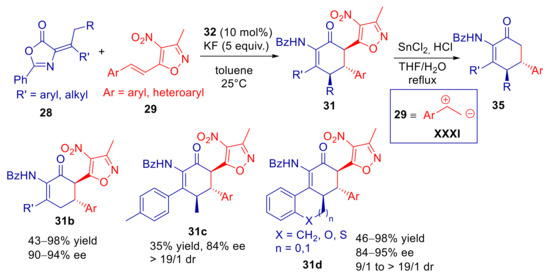Recently, Jiang, Chang and co-workers studied the γ’-vinylogous Michael addition of α-alkylidene azlactones to 4-nitro-5-styrylisoxazoles, which are heteroarylogous Michael acceptors [79]. Reaction of 28a and 29a, conducted with catalytic amounts of organic superbase 1,1,3,3-tetramethylguanidine (TMG), was sluggish at room temperature, and furnished a 1:1 mixture of products 30a and 31a (Scheme 11). While the former product was the E-configured γ’-vinylogous Michael adduct, 30a was suggested to result from trapping of heteroarylogous Z-configured α-carbanion of 5-alkyl-4-nitroisoxazole (33) by the electrophilic carbonyl group, with subsequent azlactone opening. Moving to asymmetric PTC base conditions, using bifunctional urea ammonium salt 32, cyclization product 31a was obtained almost exclusively with high yield and ee. The authors proposed that γ’-vinylogous Michael/heteroarylogous azlactone opening cascade process is driven to completion due to better Z/E selectivity in the carbanion formation step, compared to the TMG catalyzed reaction. However, the higher basicity ensured by PTC, compared to superbase catalyzed process, plays a major role in speeding up the vinylogous Michael addition reaction (see also Section 3.1). According to the authors, the steric hindrance and the H-bonding interactions of the bifunctional ammonium catalyst 32, determines the Z-selectivity in the formation of dienolate 34, and also imparts stereocontrol in the subsequent conjugated addition (Scheme 12). A survey of different substrates provided good yield and excellent ee’s with several β-aryl and β-heteroaryl 4-nitro-5-vinylisoxazoles (31b, Scheme 13). The replacement of the olefinic methyl substituent with an ethyl group caused a sluggish transformation and a poor yield, with a small decrease of ee (31c, Scheme 13). A longer alkyl group was not tolerated. Moderate to high yields and very high enantioselectivities were achieved with substrates with cycloalkylidene substituted substrates, with remarkable enantiocontrol of three contiguous stereocenters (31d, Scheme 13). What is extremely useful is the easy removal of the 4-nitroxazole group, making electrophilic alkenes 29 the synthetic equivalent for the 1,2-dipolar synthon XXXI.