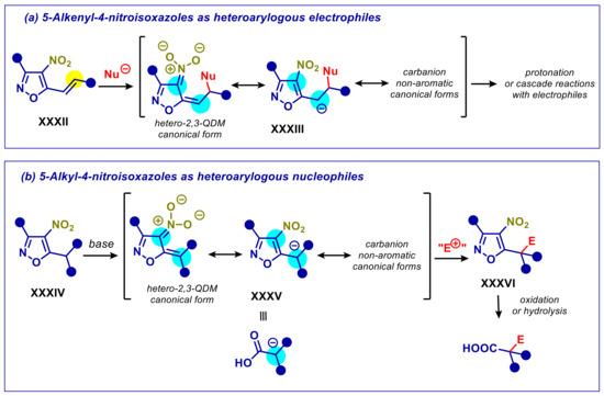 5-Alkyl-4-nitroisoxazoles have emerged as synthetically useful building blocks in organic synthesis in the recent years, due to the pharmacophoric properties of isoxazole unit and the facile transformation of the heterocyclic ring. The 4-nitroisoxazolyl group has electron-withdrawing features enabling moderate stabilization of negatively charged α-carbon. This aspect has been mainly exploited with the introduction of 5-alkenyl-4-nitroisoxazoles XXXII as Michael acceptors and dipolarophiles (Scheme 14a) [80,81,82,83,84,85,86]. On this principle, 5-alkyl-4-nitroisoxazoles XXXIV can behave as nucleophiles at heterobenzylic position, after deprotonation (Scheme 14b). The synthetic value is even more striking if one considers the facile cleavage of the nitroisoxazole framework to the carboxyl group, making intermediate XXXV a surrogate of a carboxylic acid enolate. However, such strategy proved to be challenging with homogeneous base catalysts, presumably due to the limited acidity of the heterobenzylic carbon, leading to long reaction times and low yields. Efficient transformations were only achieved turning to an electrophile activation strategy, by means of nucleophilic or iminium ion catalysis [87,88]. However, the pronucleophile-activation approach, through the action of a base, has been successfully implemented under PTC conditions, as shown below.