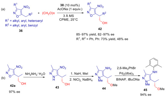 The same polyfunctional guanidinium catalyst 38 showed to be effective in the heteroarylogous aldol reaction of 36 with paraformaldehyde [90]. Under similar conditions to those adopted for the amination reaction, aldol products 42 were formed in high yields and ee’s in most cases with a broad range of substrates 36, bearing alkyl, benzyl, aryl or heteroaryl substituents, except for some cases (e.g., for 3-phenyl-5-benzyl-4-nitroisoxazole, for which 48% ee and 73% yield was detected) (Scheme 16a). As expected, Si-selectivity was attained, suggesting a transition state very close to that assumed for amination reaction and depicted in Figure 3. Better performances of PTC over homogeneous Brønsted base catalysis were also established for this process. Despite the higher reactivity of paraformaldehyde compared to 37, amino-thiourea and amino-urea bifunctional bases proved again to be ineffective catalysts, whereas good conversions were achieved with superbase TMG. Fungicide 45 was synthetized by transformation of the nitroisoxazole ring into an aminopyrazole unit (Scheme 16b).