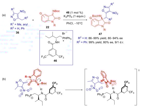 Heteroarylogous Mannich reaction 5-alkyl-4-nitroisoxazoles and N-Boc isatins catalyzed by chiral phosphonium salt 46. (a) Scope of reaction; (b) Plausible transition state. ‡ identifies the transition state.