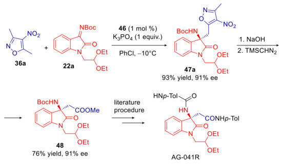 In the same year, Zhu, Wu, and co-workers extended the use of β-acylaminophosphonium salts, previously introduced for the vinylogous Mannich addition of α,α-dicyanoolefins to N-Boc imine isatins (Scheme 9), to the related process involving 5-methyl- and 5-benzyl-4-nitroisoxazoles [91]. The sec-butyl derivative 46, structural analogue of 23, proved to be the most enantioselective catalyst, using K3PO4 as the inorganic base in chlorobenzene at −10 °C. Under such optimized conditions, a quite wide range of products, containing both the isoxazole and aminooxindole pharmacophores, were delivered in high to excellent yields and enantioselectivities (Scheme 17a). The authors speculated that the amide functional group might play a key role as a hydrogen bond donor in orienting and activating the N-Boc isatin electrophile (Scheme 17b). Some useful synthetic elaborations were also presented. Boc group has been substituted with an acyl group in two steps with minimal erosion of enantiomeric purity. Moreover, hydrolytic cleavage of isoxazole moiety of the derivative 47a, followed by esterification of the resulting carboxyl group, gave access to the synthetic precursor of AG-041R, a potent gastrin/CCK-B receptor agonist (Scheme 18).