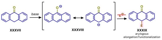 9-Anthrones are relevant molecules, due to their biological activity and applications in chemistry of materials [92,93], which represent a special case of arylogous substrates. The facile enolization at C-10, generating fully aromatic intermediate 9-anthrolate XXXVIII, enables straightforward functionalization or elongation promoted by weak base organocatalysts [94,95,96,97,98,99] (Scheme 19).