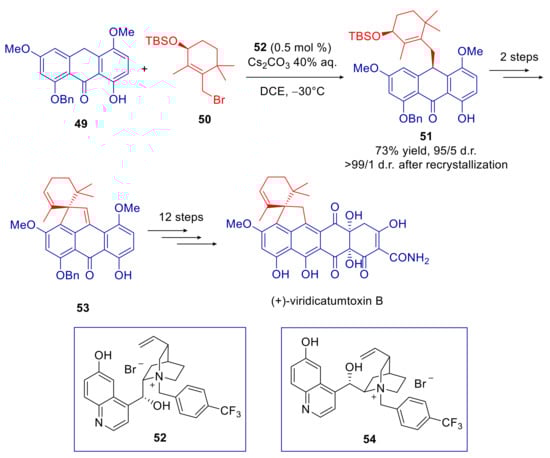 However, phase transfer catalysis remains the preferred strategy for reaction with alkylating agents [100,101]. In particular, asymmetric PTC is particularly recommended to achieve mono-alkylation products enantioselectively, avoiding racemization of the newly generated stereocenter. En route to the synthesis of the anthracycline antibiotic (+)-viridicatumtoxin B, Nicolaou and co-workers realized the diastereoselective C-alkylation of the polyoxygenated 9-anthrone 49 with the chiral allylic bromide 50 [102]. After an extensive screening of reaction conditions, intermediate 51 was obtained in 73% yield and 95/5 diastereomeric ratio with the cupreine derived phase-transfer catalyst 52 (Scheme 20). The authors demonstrated that no epimerization occurred during the process. Lower stereoselectivity was obtained with the chiral Brønsted base β-isocupreidine. Diastereomerically pure 51 was achieved after recrystallization and submitted to a 14 steps synthetic sequence to provide (+)-viridicatumtoxin B, so determining unambiguously its absolute configuration. The optical antipode (−)-viridicatumtoxin B was obtained in analogous way, through the intermediate ent-51, in the alkylation of 49 with ent-50 catalyzed by the pseudoenantiomer of salt 54 derived from cupreidine. In addition to the natural products, synthetic intermediates (+) and (−)-53 proved useful to prepare a library of synthetic analogues with comparable or even higher antimicrobial activity.