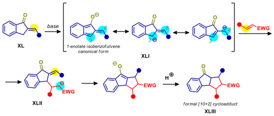 α-Alkylidene-indanones XL have been long neglected as arylogous nucleophiles in organic synthesis. The reason for this could be that deprotonation of endocyclic 3-carbon, generating a π-extended carbanion with partial dearomative 1-hydroxyl character XLI (Scheme 21), has proven difficult. For instance, while asymmetric aminocatalysis turned out to be an effective tool in generating 8-amino isobenzofulvene intermediates from indene 2-carbaldeydes, resulting in enantioselective cascade processes [103,104], it failed when applied to substrates XL [105]. In contrast, non-aromatic 4-amino fulvene intermediates are easily formed starting from vinylogous α-alkylidene-cyclopentenones, furnishing formal [4+2] cycloadducts in reaction with electrophilic alkenes [106]. However, the diastereoselective dimerization of 1-alkylidene-indanones, via anionic intermediate XLI, has been reported heating with alkoxide or inorganic bases in polar solvents [107,108]. The anion XLI resulting by deprotonation of XL is a resonance hybrid represented by a dearomative 1-enolate isobenzofulvene canonical form, along with aromatic C-3 and C-8 carbanion forms. However, despite the potential ambident nucleophilicity, reactions with Michael acceptors have been reported to occur selectively at the C-3 site resulting in a formal [10+2] cascade process (Scheme 21).