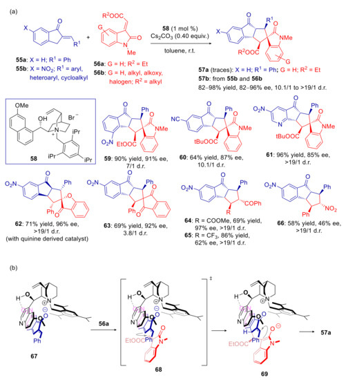 The sole example of asymmetric formal [10+2] cycloaddition of 2-alkylidene-1-indanones has been reported by Chen and coworkers, exploiting chiral phase-transfer catalysis [105]. Chiral amines failed to promote reaction of indanone 55a with 3-alkylidene oxindole 56a. Moderate conversion (30% yield) to the expected spiro cycloadduct 57a were instead achieved under PTC conditions, employing TBAB (tetrabutyl ammonium bromide). Unfortunately cinchonidine derived ammonium salts provided only traces of 57a. However, better results were attained with the more acidic nitro-substituted indanones 55b. In the presence of catalytic amount of quinidine derived ammonium salt 58 and Cs2CO3, cycloadducts 57b were released in good to excellent diastereoselectivities and high enantioselectivities (Scheme 22a). The opposite enantiomer was produced with the corresponding quinine derived catalyst. This methodology was also extended to other electron poor substituted 2-alkylidene-1-indanones and electrophilic alkenes with generally good results, with the exception of β-nitrostyrene and 4,4,4-Trifluoro-1-phenyl-2-buten-1-one, providing products 59–66. In addition, substitution of 4-nitro group by palladium catalyzed Suzuki coupling or via diazonium salt, gave access to further derivatives. Models for the ion pair involved and the transition states of both steps were also proposed by the authors (Scheme 22b). The ion pair 67 would be stabilized by hydrogen bonding and π-stacking interactions, orienting 55a in such a way that Si face is more exposed to the electrophilic attack of 56a. The observed diastereoselectivity would be governed by steric hindrance minimization in the transition state 68, with the aromatic ring of 56a far away from the substituted benzyl group of the catalyst. In the resulting ternary intermediate 69, the reactants would be arranged so that Re face attack would be favored, bringing to product 57a. However, whatever the true mechanism, the free OH group of catalyst 58 should play a key role, since the employment of the protected O-benzyl derivative led to a prevalence of the opposite enantiomer.