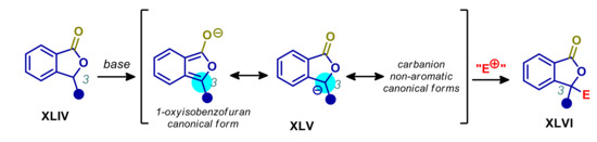1(3H)-Isobenzofuranones XLIV, more commonly known as phthalides, are aromatic lactones widespread in natural sources and exhibiting a broad range of biological activities, capturing the interest of synthetic community [109,110]. A possible strategy aiming at the introduction of a stereocenter at C-3, is the generation of an arylogous enolate XLV, under the action of a sufficiently strong base, followed by the treatment with the appropriate electrophile (Scheme 23). Normally this approach requires the use of strong bases, such as metal amides, with poor control of the stereoselectivity [111,112,113,114]. Alternatively, the acidity of C-3 may be enhanced by directly introducing an additional unsaturated electron-withdrawing group at this site (e.g., COOR and CN), thus making possible enantioselective and diastereoselective reactions, even with catalytic amounts of moderately strong bases [115,116,117,118,119,120,121,122,123]. However, since these activated substrates are not strictly arylogous pronucleophiles, they will not be covered in this review.