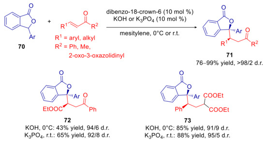 In 2017, taking advantage of the strong basicity of alkali hydroxides in non-polar solvents under PTC conditions, we realized the first true arylogous reaction of 3-arylphthalides [124]. In particular, a diastereoselective arylogous Michael reaction (AMR) of substrates 70 with α,β-unsaturated carbonyl compounds was developed, using catalytic amounts of solid KOH or K3PO4 and crown ethers (Scheme 24). After screening of catalysts and solvents, we achieved syn adducts 71 as single diastereomers in good yields in almost all cases examined using catalytic dibenzo-18-crown-6 in mesitylene, whereas a small decline of d.r. was observed for products 72 and 73. The use of stronger base KOH ensured shorter reaction times, although generally higher yields and occasionally improved d.r. were attained with K3PO4. Similar results were observed in other non-polar solvents such as toluene, and diverse 18-crown-6 derived catalysts. Interestingly, use of more polar solvents and 15-crown-5 derivatives or tetrabutyl ammonium bromide (TBAB) as the catalysts, led to a significant decrease of diastereoselectivity. This effect, already noted in the previously described VMMR of 7 (Scheme 4, Figure 2) [59], has been studied in detail for 3-unsubstituted phthalide derivatives (see below) and must be attributed to the involvement of a chelated model, which favors the exo approach between reactants and the consequent formation of the syn diastereomer. Another factor that should be stressed for this reaction is the superiority of PTC compared to the use of catalytic organobases. In particular, we found that catalytic amounts of triethylamine failed to promote the AMR [124], whereas superbases such as DBU and phosphazene P1-t-Bu-tris(tetramethylene) (BTPP) provided complete conversion after several days and with slightly lower d.r. compared to the metal hydroxide/crown ether system [125].