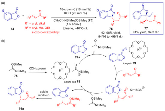 3-unsubstituted and 3-alkyl phthalides are less reactive than 3-aryl derivatives due to the less effective stabilization of the arylogous 1-oxyisobenzofuran enolate LV. As evidence, a reaction of 1(3H)isobenzofuranone with trans-chalcone, conducted under conditions illustrated in Scheme 24, furnished only traces of expected adduct [60]. In addition, using stoichiometric amounts of KOH and 20 mol % of dicyclohexane-18-crown-6, led to capricious results, with a maximum yield of 55% and 93/7 syn diastereoselectivity, mainly due to competing lactone opening. A suitable protocol for such inactivated substrates was devised using catalytic amounts of KOH and crown ether, along with stoichiometric N,O-bis(trimethylsilyl)acetamide (BSA, 75), at low temperature. The best balance between reaction times, yields and diastereoselectivity was attained by employing 18-crown-6 at −40 °C in toluene, with a few exceptions of less reactive substrates requiring higher temperatures (Scheme 25a). Under these conditions, good to excellent yields and syn diastereoselectivities were obtained in the arylogous addition to α,β-unsaturated ketones, esters and N-acyloxazolidinones. Also noteworthy was the application to 3-alkyl substrate, affording 77 in high yield and d.r., although the lower reactivity required to conduct the addition at −20 °C. The role of BSA in speeding up the process and reducing byproducts is probably the generation of base intermediate amide salt 78 and the enolate adduct trapping (Scheme 25b).
