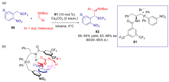 - Xu, L.; Yu, L.; Liu, J.; Wang, H.; Zheng, C.; Zhao, G. Enantioselective Vinylogous Mannich-Type Reactions to Construct CF3S-Containing Stereocenters Catalysed by Chiral Quaternary Phosphonium Salts. Adv. Synth. Catal. 2020, 362, 1851–1857. [Google Scholar] [CrossRef]