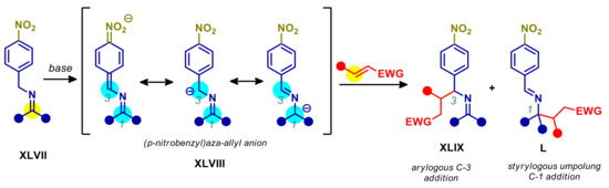 As mentioned before, base catalyzed heteroarylogous reactions are generally more difficult to perform than ordinary vinylogous processes, since the stabilization of the heterobenzylic carbanion VI/IX is less effective compared to the functionalized allyl carbanion II (Scheme 1a,b). Such transformations are better conducted with aminocatalysis [3,6]. However, few examples using base promoted PTC have been reported and described in the following section.
