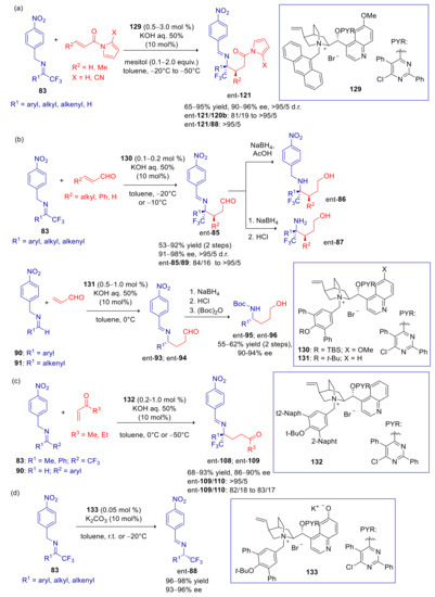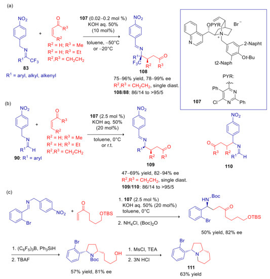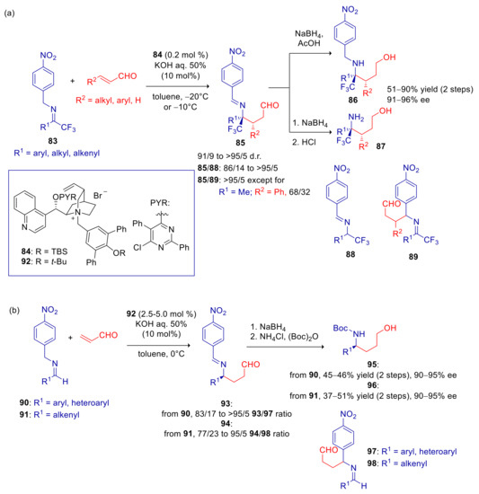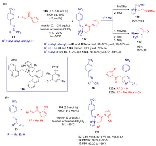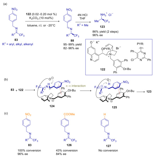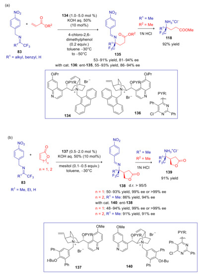 - Zhou, X.; Wu, Y.; Deng, L. Cinchonium Betaines as Efficient Catalysts for Asymmetric Proton Transfer Catalysis: The Development of a Practical Enantioselective Isomerization of Trifluoromethyl Imines. J. Am. Chem. Soc. 2016, 138, 12297–12302. [Google Scholar] [CrossRef]