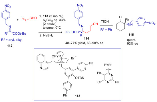 An asymmetric direct vinylogous aldol reaction of (5H)-furan-2-ones catalyzed by in situ generated cinchona alkaloids derived 4-methoxy-phenoxide salts was also reported [61]. Despite the analogies with the VMMR of 6 described above, given the involvement of a catalytic Lewis base salt, this process is not performed under phase-transfer conditions, being all the components soluble in the reaction medium, and therefore not further discussed herein.